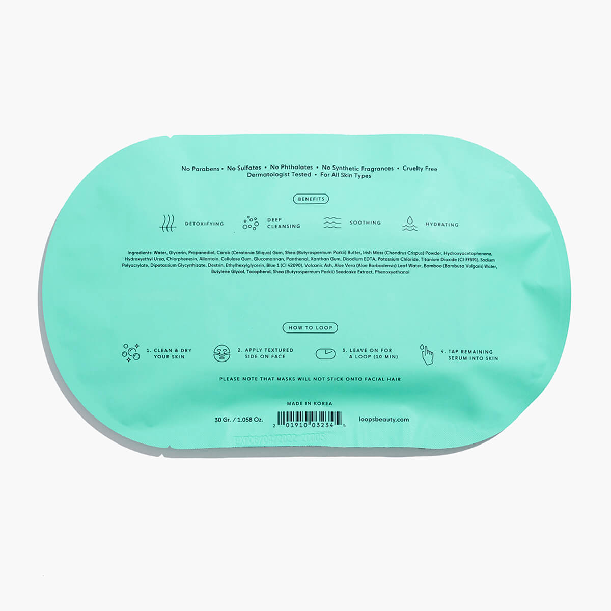 Water, Glycerin, Propanediol, Ceratonia Siliqua (Carob) Gum, Butyrospermum Parkii (Shea) Butter, Chondrus Crispus Powder, Hydroxyacetophenone, Hydroxyethyl Urea, Chlorphenesin, Allantoin, Cellulose Gum, Glucomannan, Panthenol, Xanthan Gum, Disodium EDTA, Potassium Chloride, Titanium Dioxide (CI 77891), Sodium Polyacrylate, Dipotassium Glycyrrhizate, Dextrin, Ethylhexylglycerin, Blue 1 (CI 42090), Volcanic Ash, Aloe Barbadensis Leaf Water, Bambusa Vulgaris Water, Butylene Glycol, Tocopherol, Butyrospermum Parkii (Shea) Seedcake Extract, Phenoxyethanol
