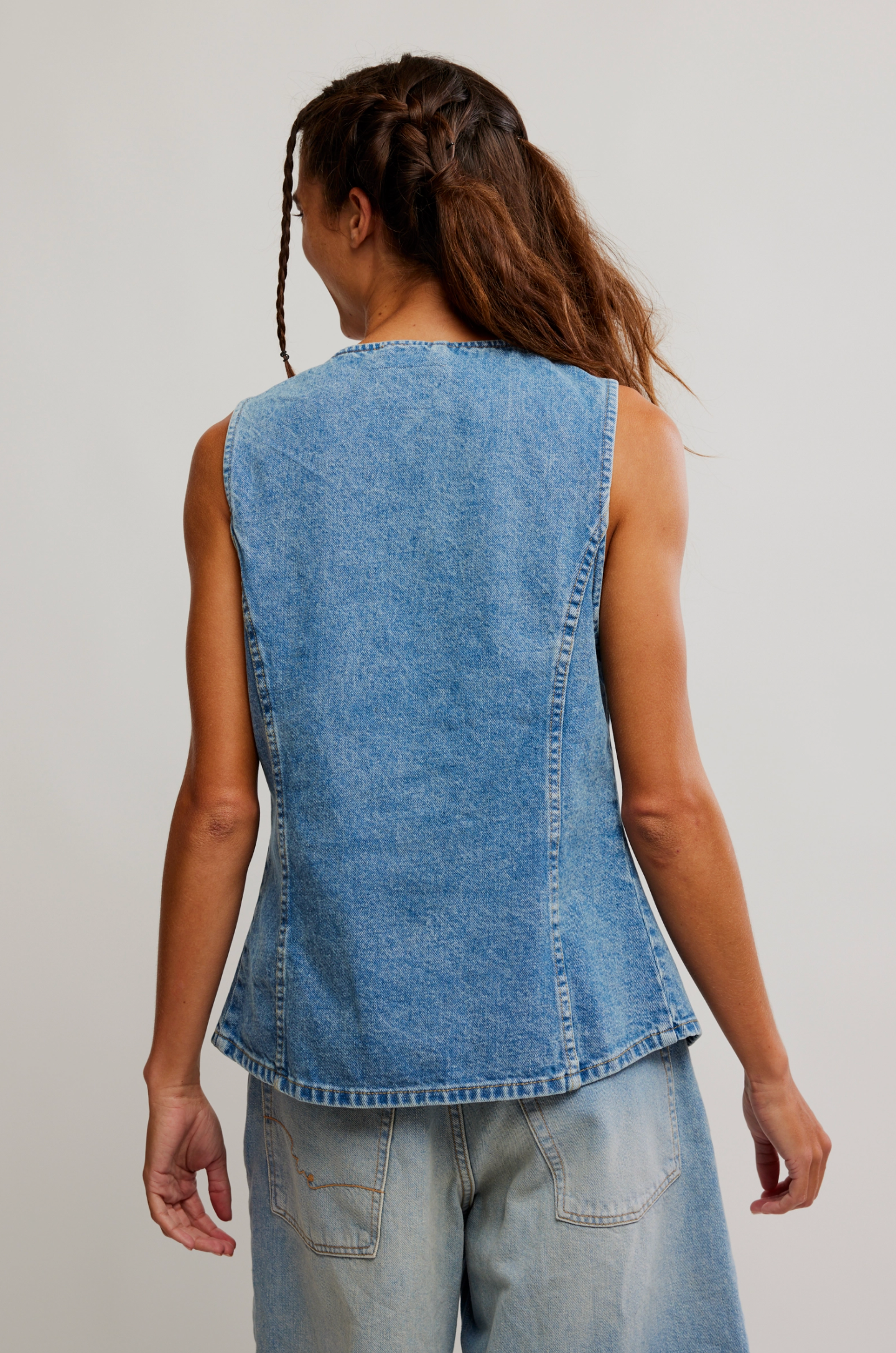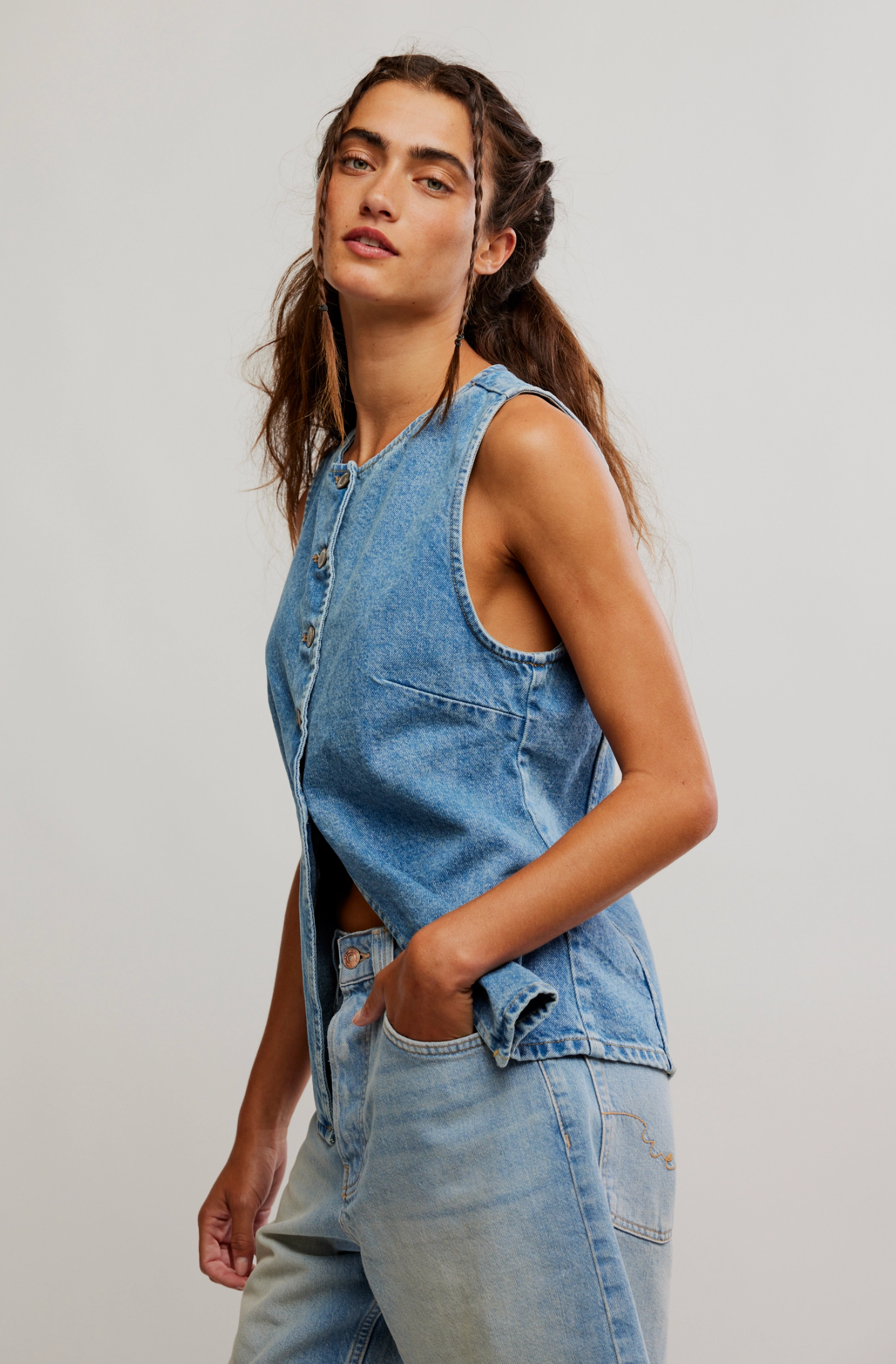Silhouette is everything with this simple denim vest from Free People's We The Free, featured in a crew-neck style with intentional darting, buttons down the front, and a flared hem for an ultra-flattering fit.