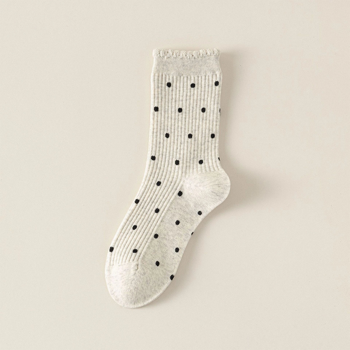 Sweet with a subtle twist, the Polka Dot Ruffle Crew Socks add just the right amount of charm to your everyday styling (without feeling overly cutesy). Designed with a soft ribbed knit and scattered micro polka dots, these socks feature a delicate ruffle trim at the cuff for a feminine, vintage-inspired finish.