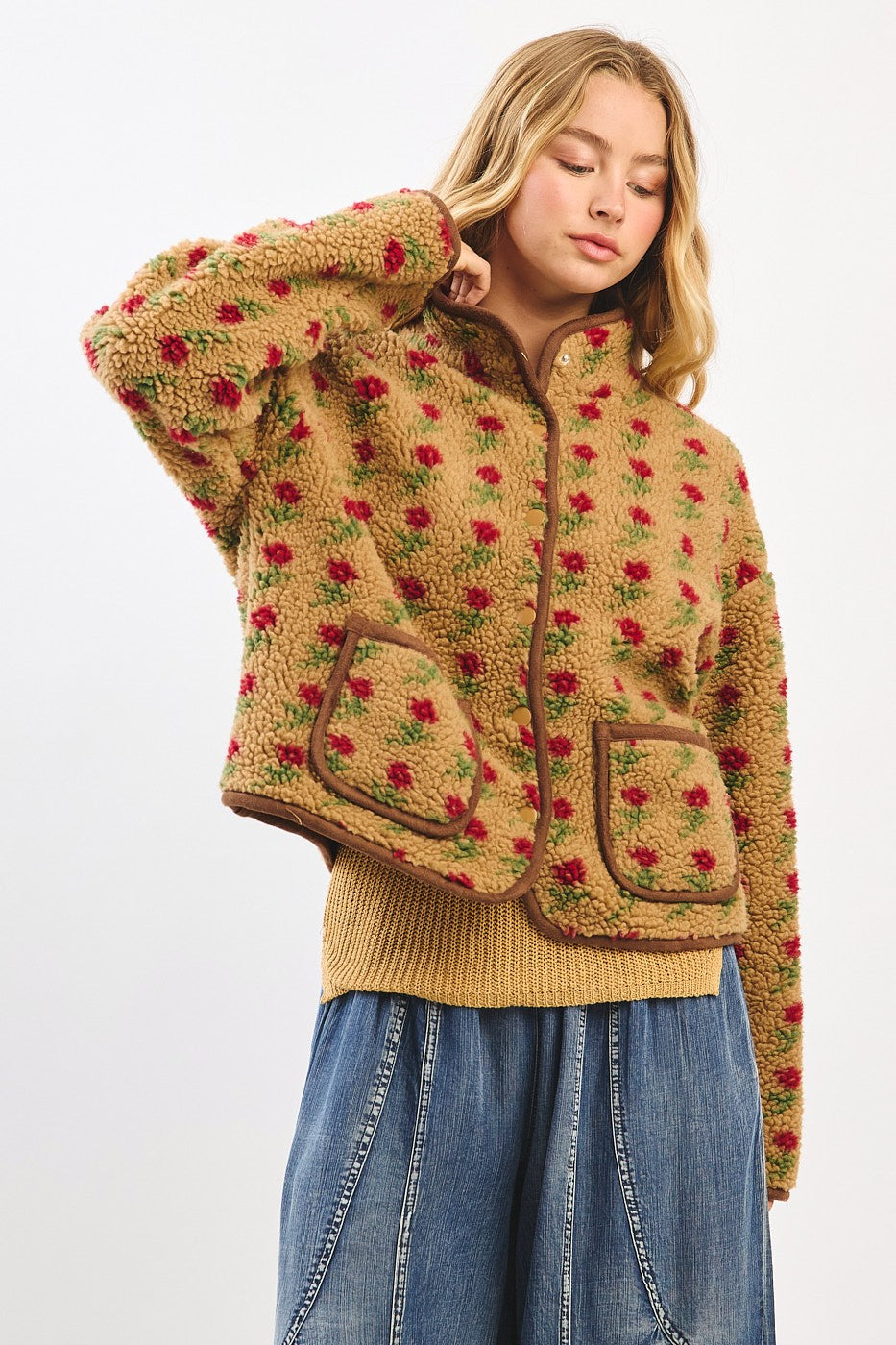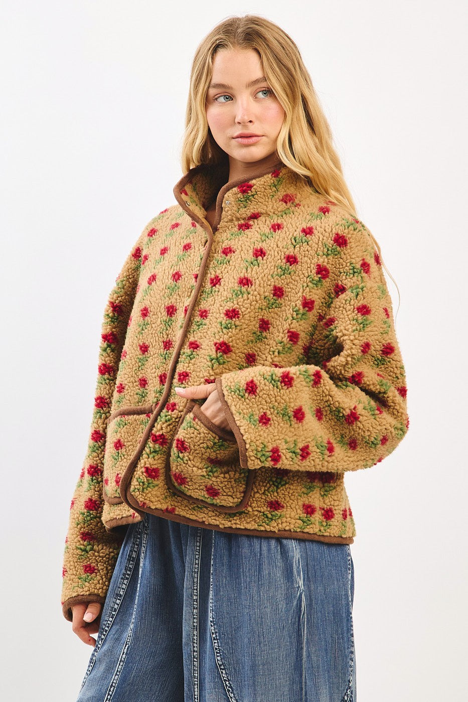 The Rosewood Fleece is the definition of cozy cottage charm. Crafted from plush sherpa fleece and adorned with dainty rose blooms, it brings a touch of nostalgia to your fall and winter wardrobe. The soft caramel base and vintage-inspired floral print make it both timeless and unique. The contrast trim and snap-front closure add a polished touch, while the relaxed fit layers beautifully over your favorite knits and denim.
