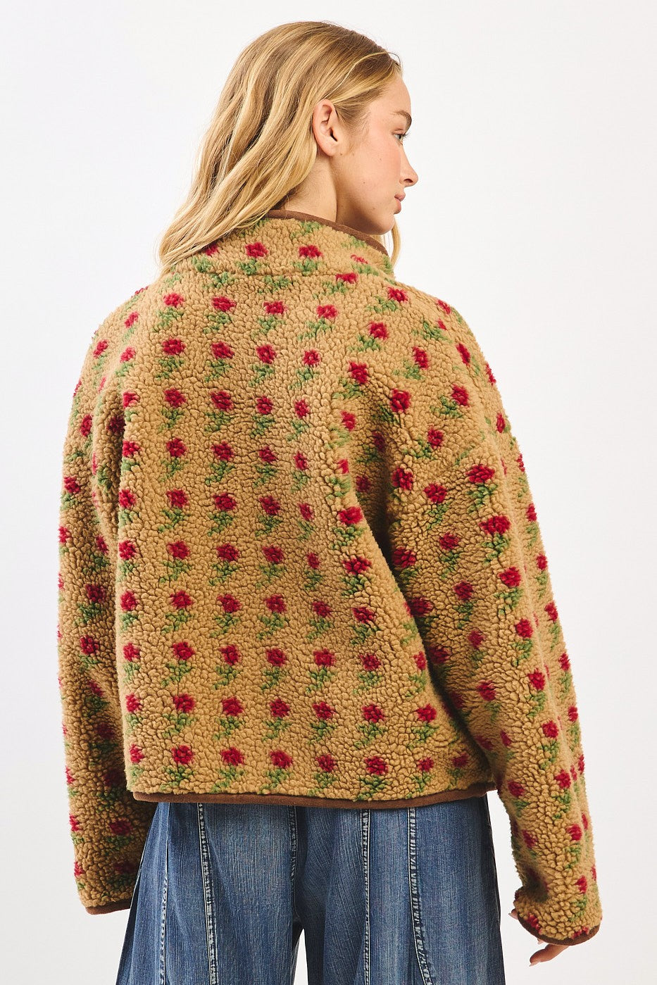 • Floral sherpa fleece with vintage-inspired rose detailing