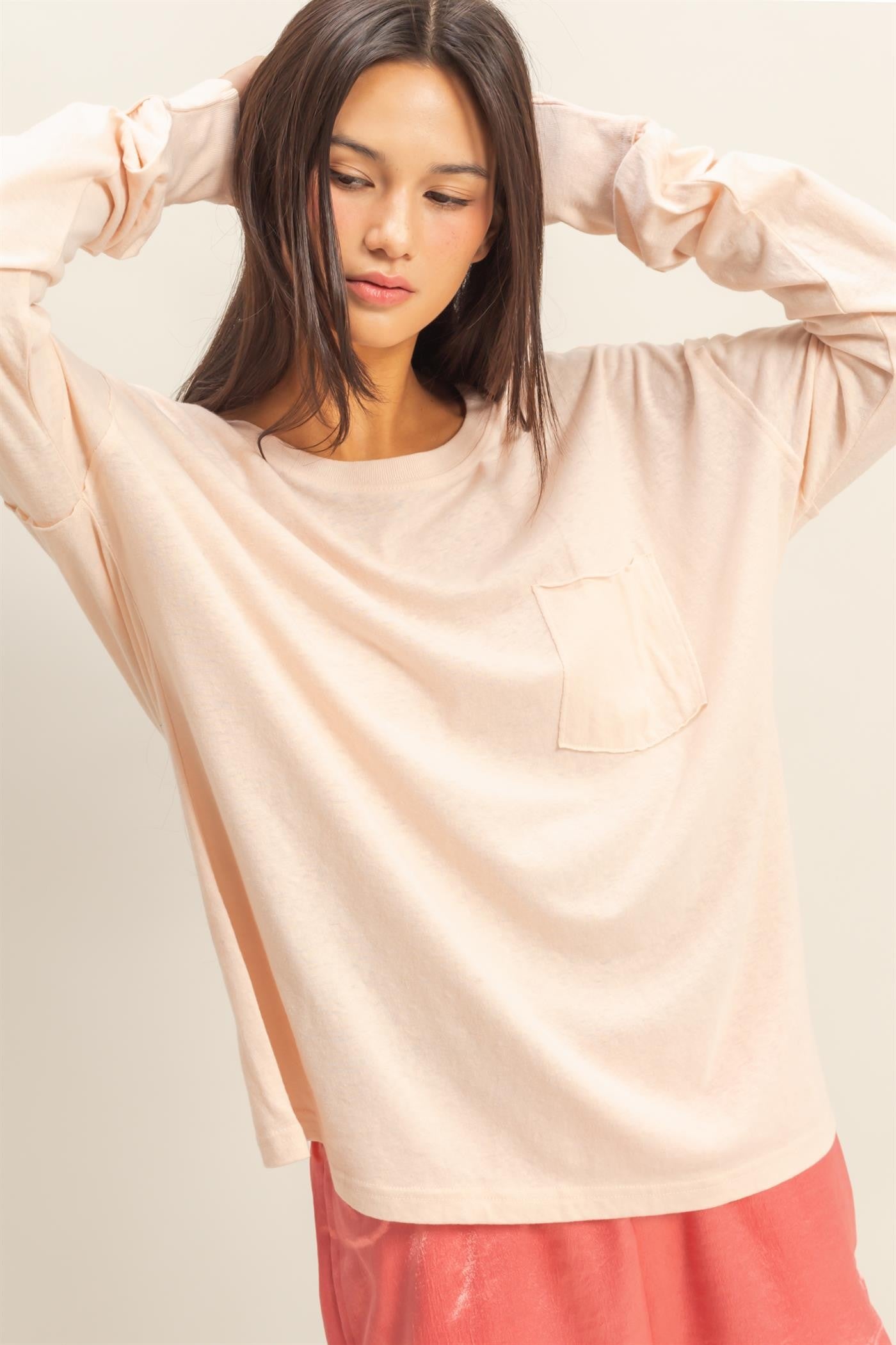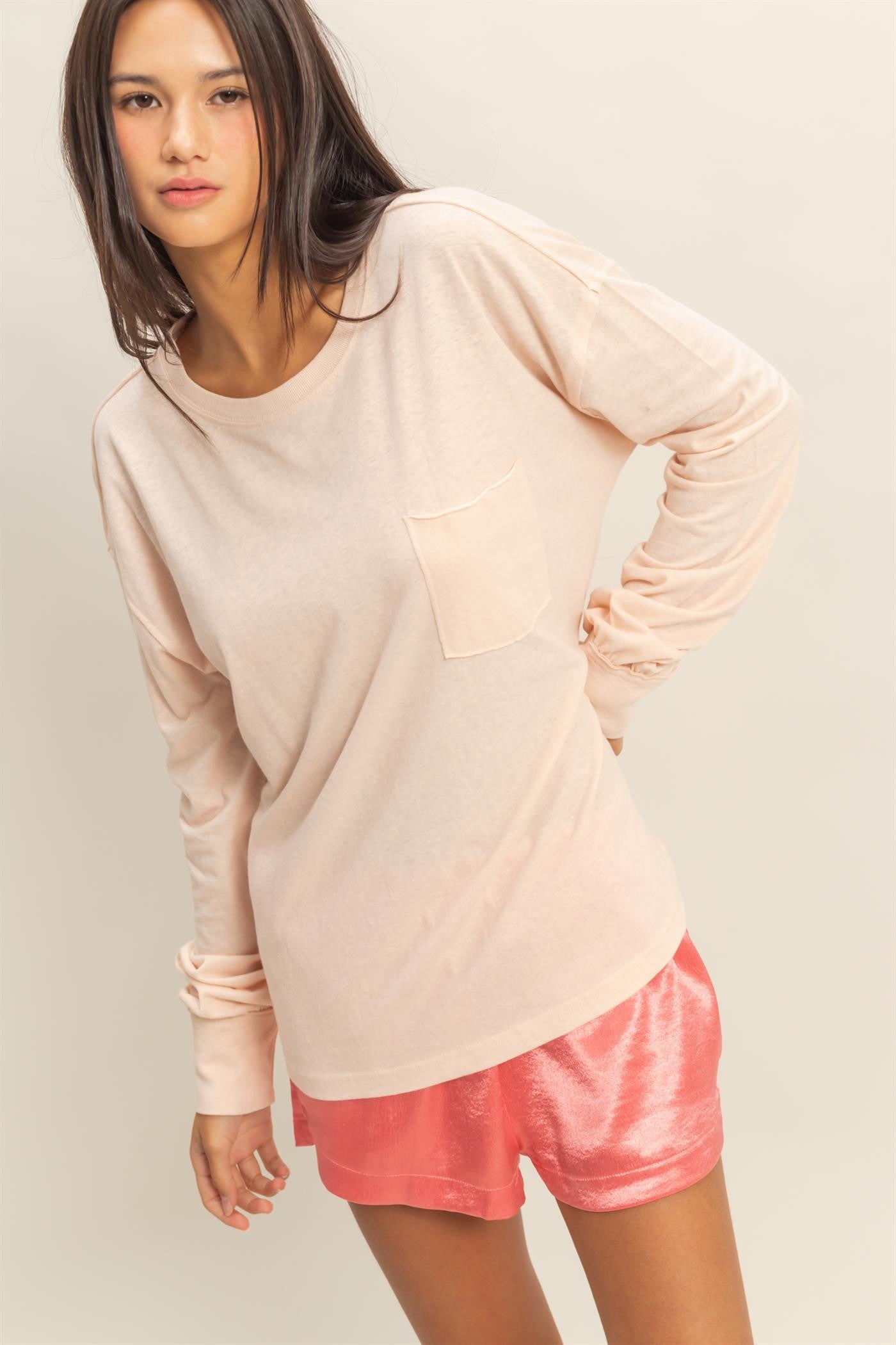 Easy, effortless, and perfectly broken-in. The Lived-In Pocket Tee features a relaxed fit with drop shoulders, long sleeves, and subtle raw-edge detailing for that perfectly undone look. Soft to the touch with just the right drape, this long sleeve tee is ideal for layering, lounging, and everyday wear.