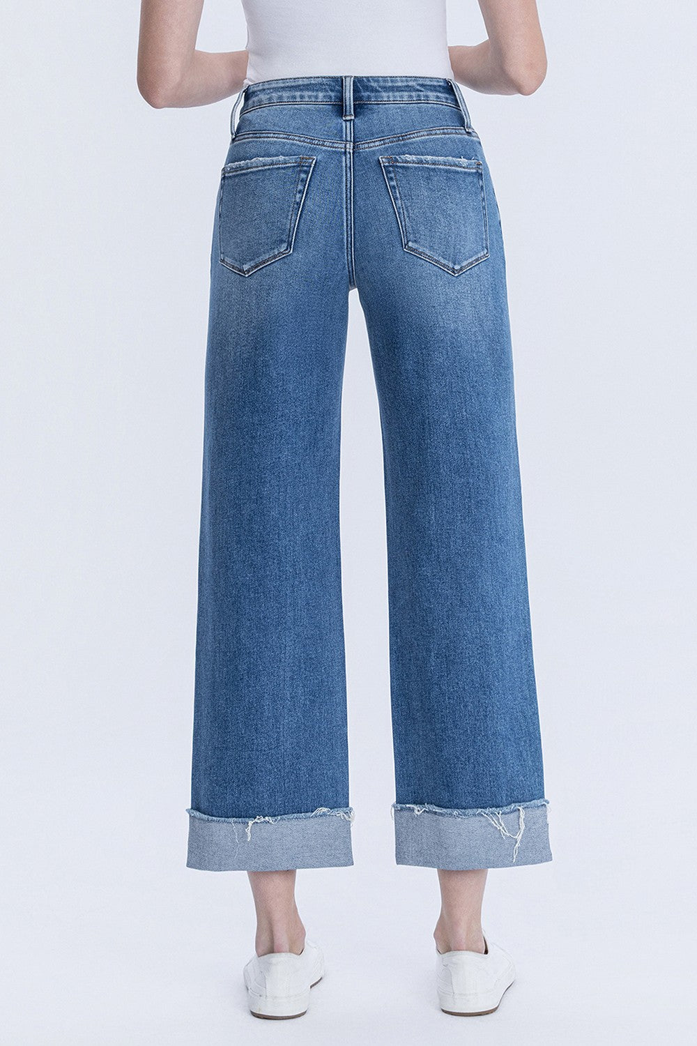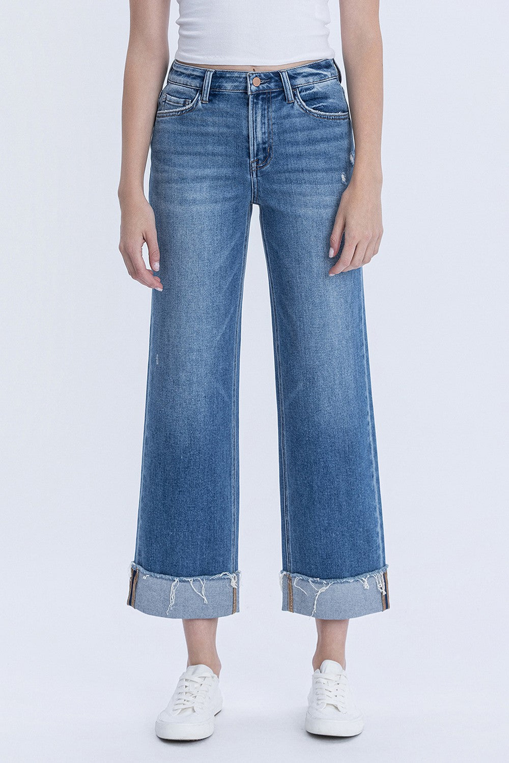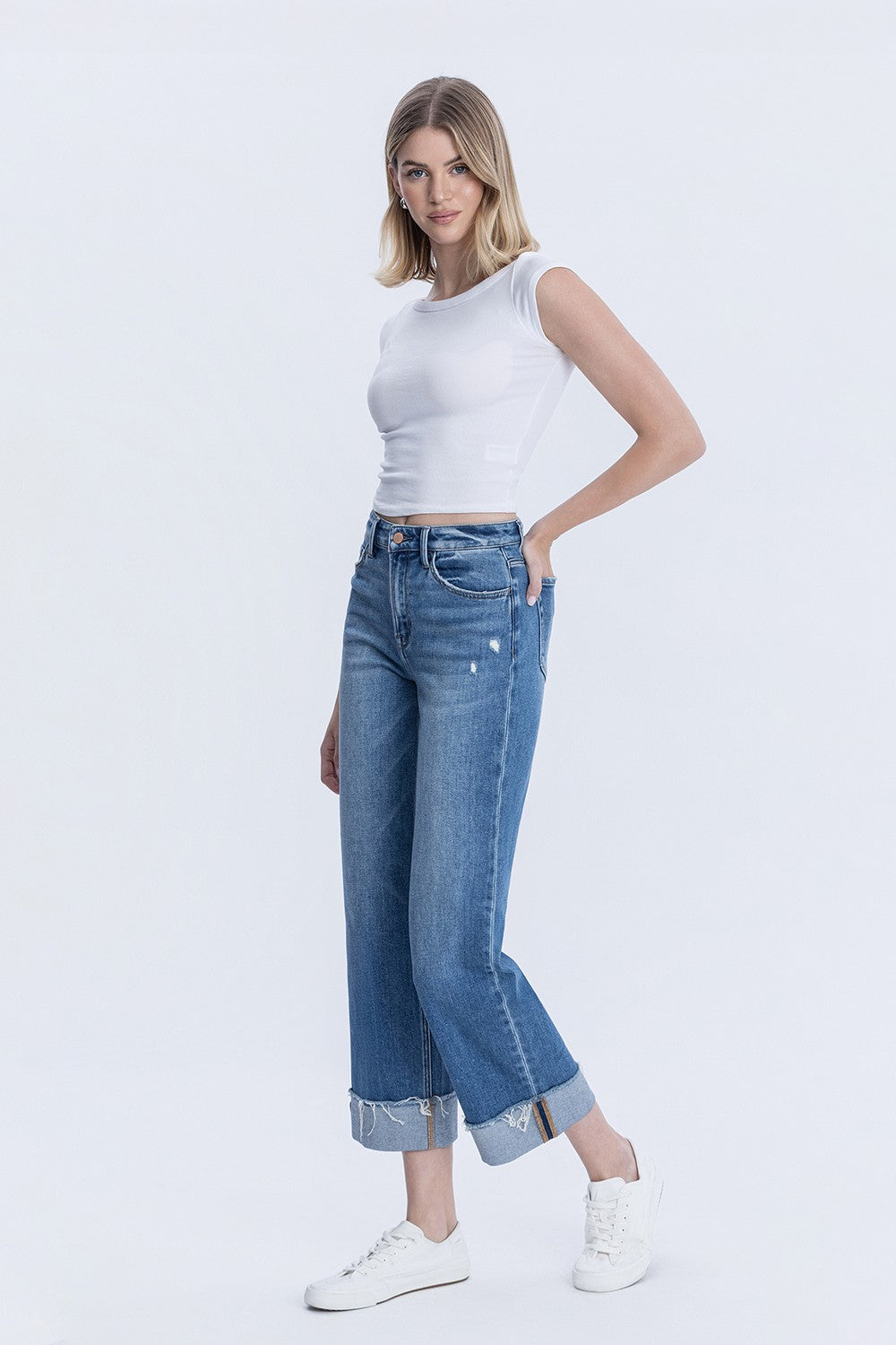 Flattering, modern, and just the right amount of edge — the Harlow Cuffed Slim Wide Jean is one of those pairs you’ll reach for on repeat. Designed in a versatile medium wash with subtle distressing, this jean features a high-rise waist that holds you in comfortably and a slim wide-leg silhouette that elongates without feeling overwhelming.