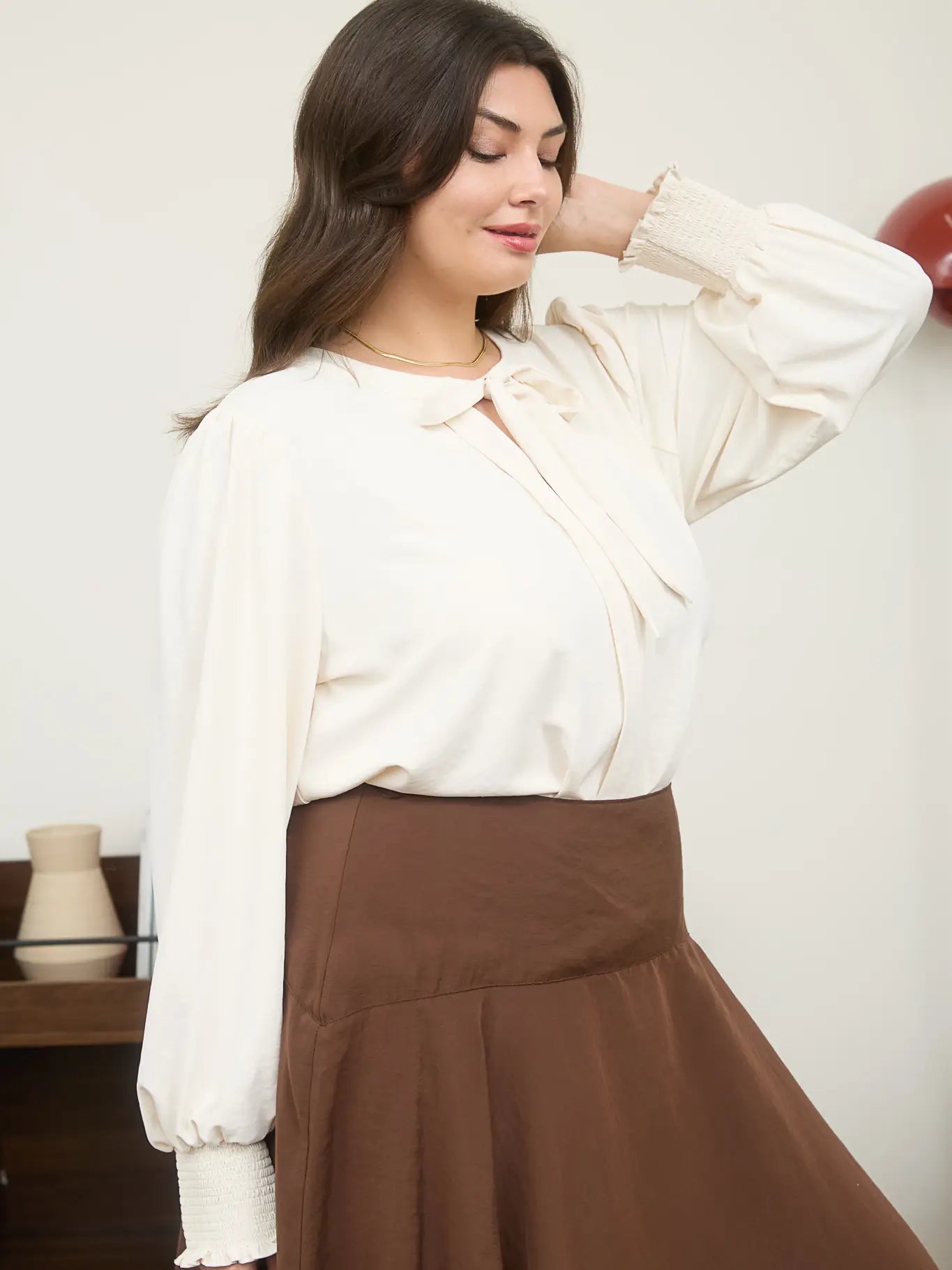 The Chestnut Lane Necktie Blouse is an effortlessly polished piece with a timeless fall palette. Designed in a warm chestnut hue, it features a graceful V-neckline with an attached necktie that can be worn in a bow or left loose for a relaxed look. Long sleeves gather into smocked cuffs for a touch of texture, while the front seam fold detail adds subtle sophistication. Lightweight and fluid, it’s perfect for pairing with trousers, skirts, or layered under a blazer for a refined pre-fall outfit.