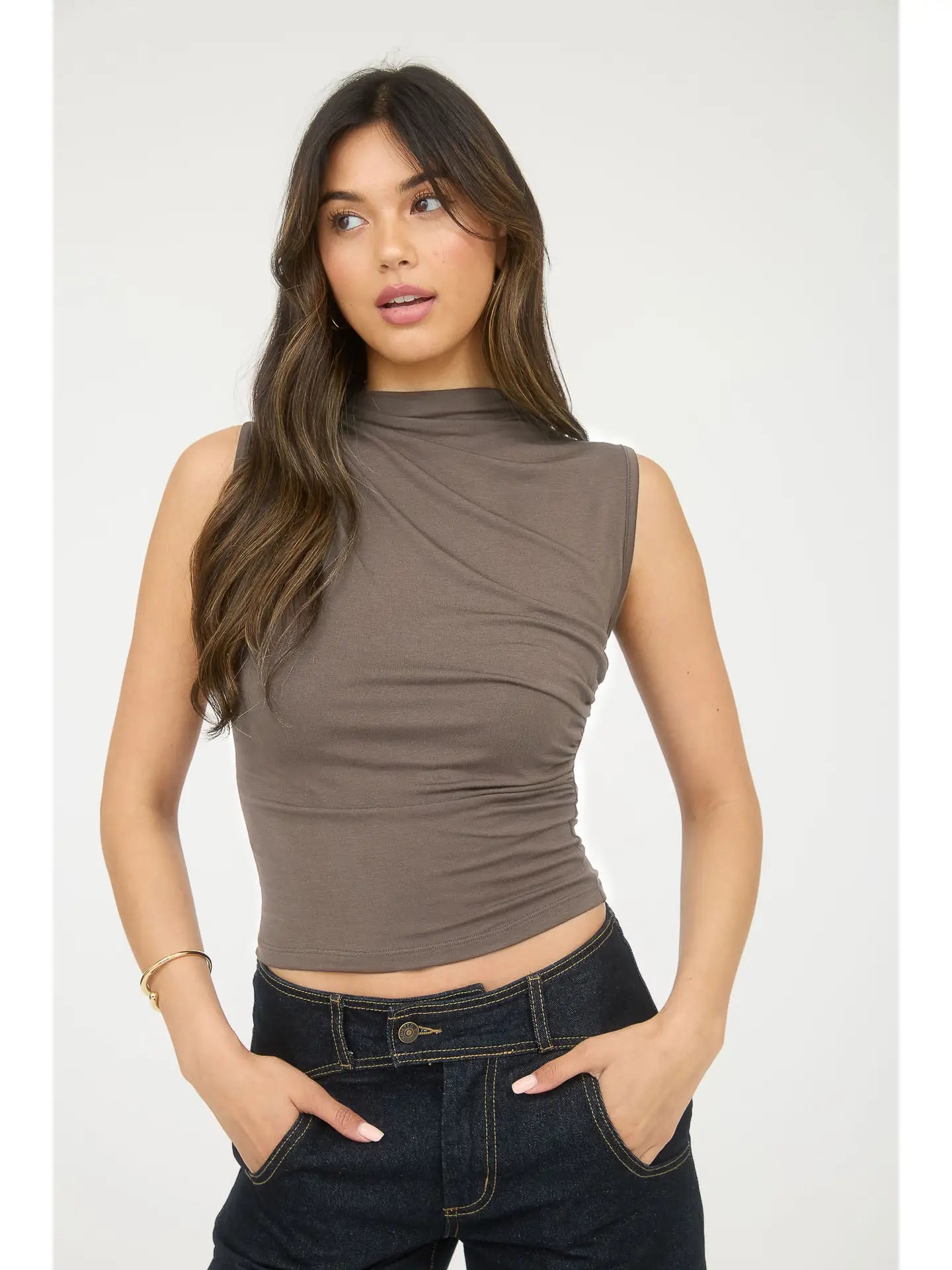 The Colette Mock Neck Knit Top is a refined layering essential designed for smooth transitions from summer to fall. Made from a soft, stretchy rayon-spandex blend, it features a sleek mock neckline, sleeveless cut, and subtle ruched shoulder detail for a touch of feminine shape. This versatile knit pairs effortlessly with high-waisted denim, wide-leg trousers, or layered under blazers and cardigans for a polished pre-fall look. Lightweight and breathable, it’s ideal for both workwear and casual weekend outfits.
