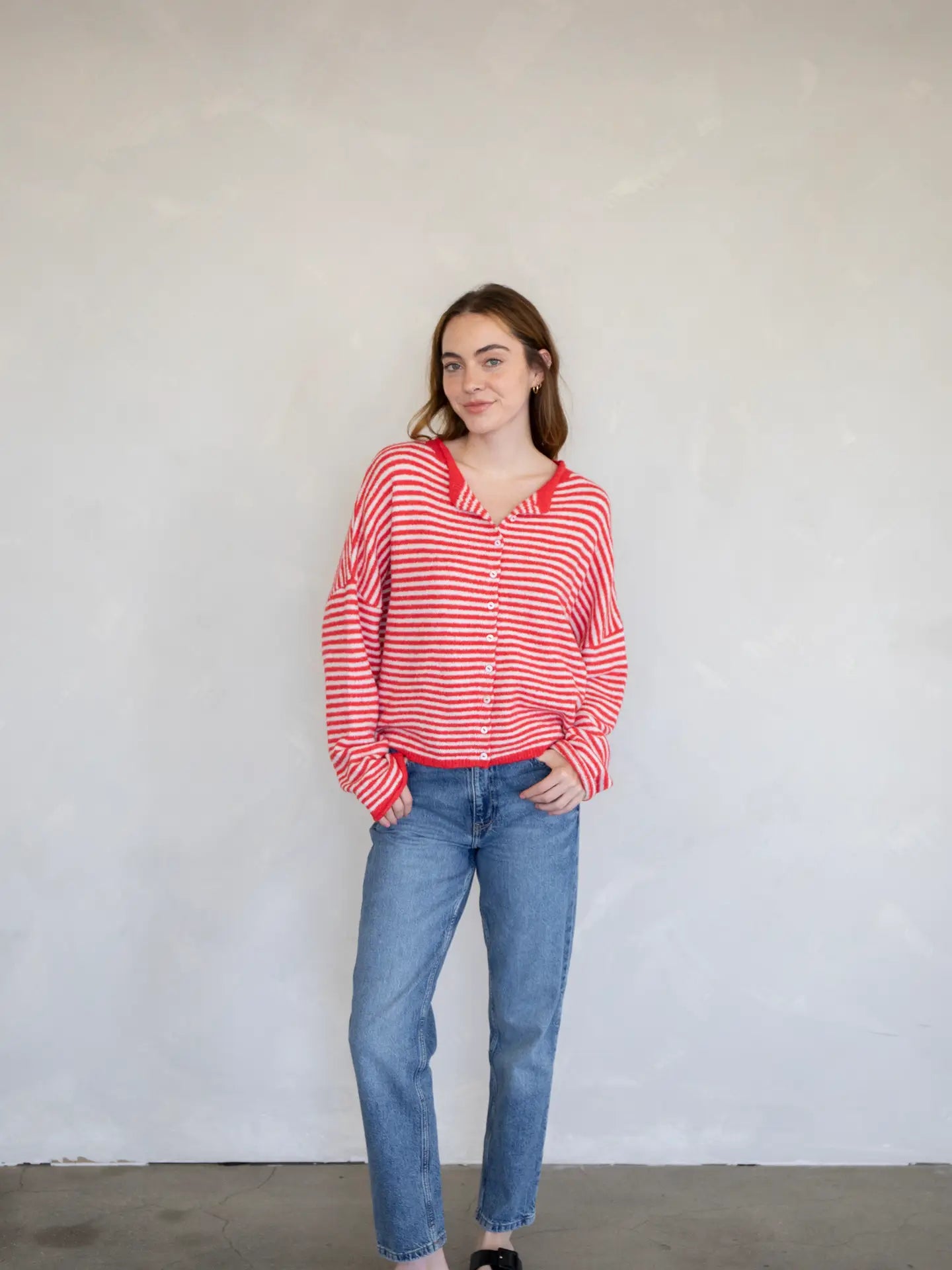 Stay warm and stylish this fall with our best selling Hudson Cardigan now in a fun mini red stripe! This cardi is a best seller for a reason. The fit is the perfect blend of relaxed yet chic. A soft a light weight material, this cardi will be a STAPLE in your closet for every day wear. Our favorite way to style? Layered with a basic white crew, your favorite denim, chunky gold jewelry, and some sneakers for the perfect elevated casual look. With trendy rolled cuff/collar details, a fit that hits just right at your hips for a flattering shape, and an oh-so-soft feel, its no wonder we cant keep these sweaters in stock. This will be one that you need in EVERY color! (Trust us, we can't stop wearing her!)