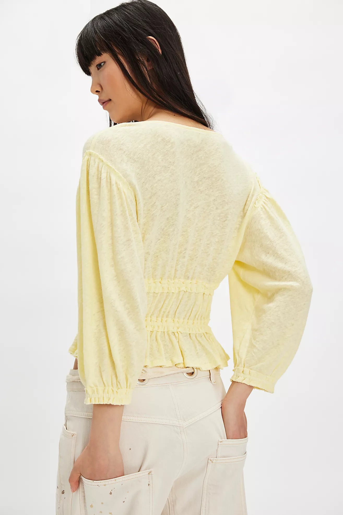 Features: Cotton-linen fabrication, V-neckline, tie-front closures, shirred bodice drop-shoulder ¾ length sleeves, cinched cuffs, subtle peplum