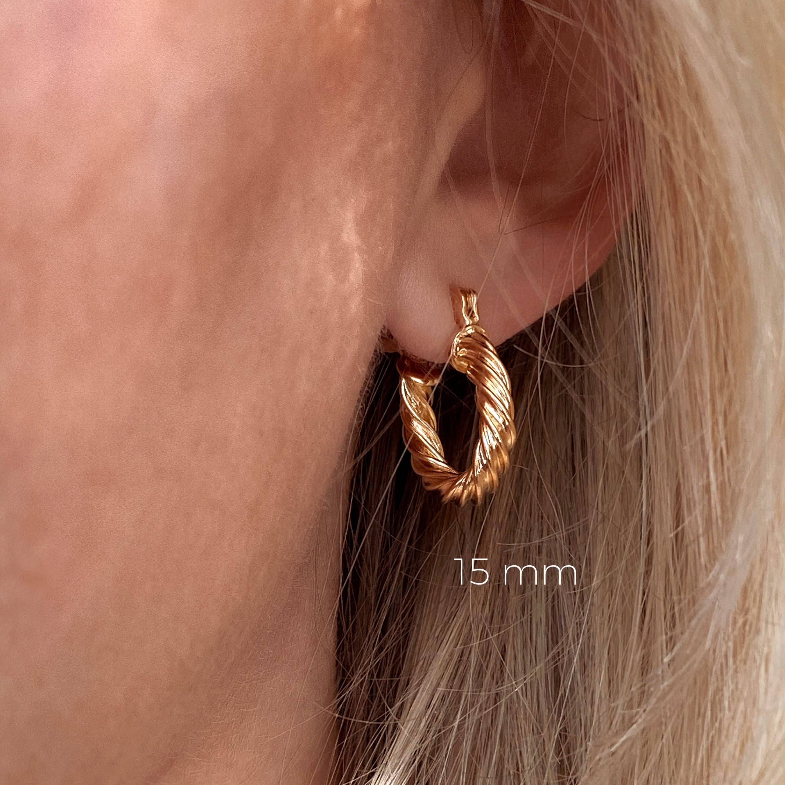 18k gold filled twisted hoop earrings. Available in 15mm Hypoallergenic! Wear while bathing, on the beach or in the pool, this piece was meant to be lived in. Enjoy the best 18k Gold Filled that is made to last.