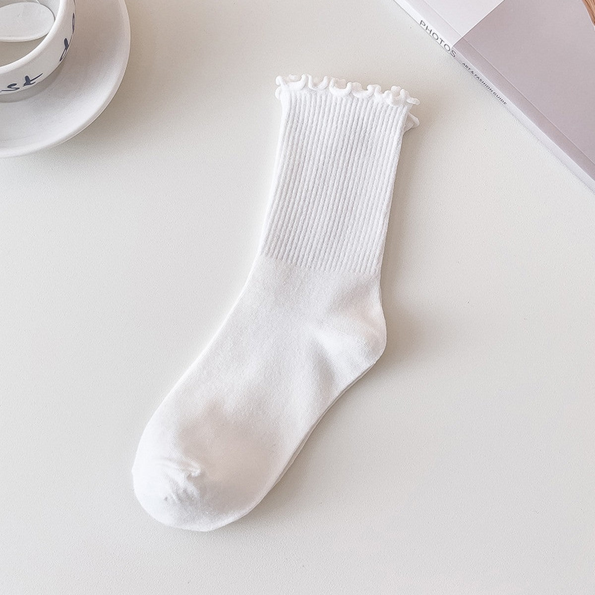 Sweet and simple, these 100% cotton mid-crew socks feature a soft ribbed top and a delicate ruffle trim for that perfectly feminine finish. Lightweight and breathable, they add a subtle pop of charm to everything from sneakers to loafers.